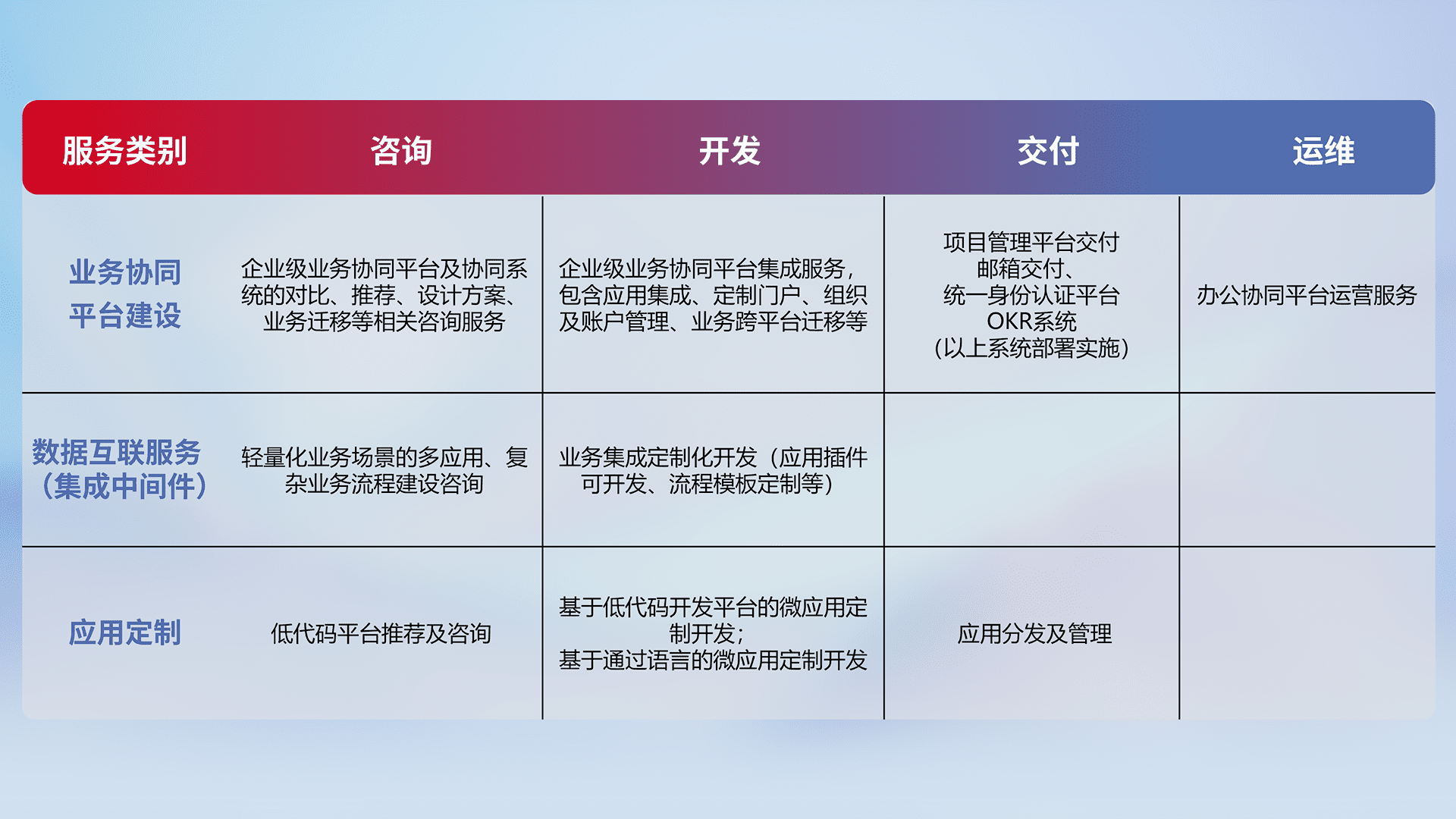 针对钉钉、、、企微、、IDaas等平台级产品提供产品的规划、、、、方案、、交付、、、定制化开发等服务,,,实现如统一协同办公、、、、智能客户服务、、混合会议管理、、、、智能数据查询、、、等业务场景,,,,实现数字化转型。。